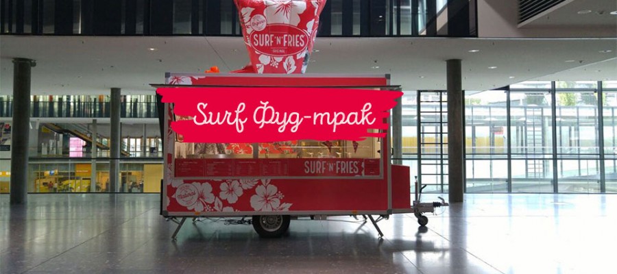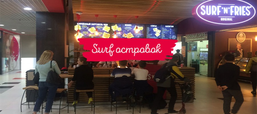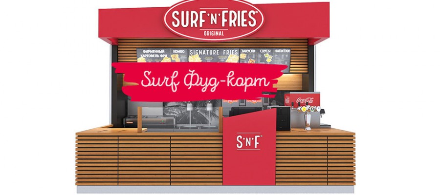 Surf-киоск. Это оформленная кухня с витриной для продаж. Нет необходимости обустраивать посадочные места. Яркий и стильный дизайн. Производительность кухни рассчитана на приготовление всех блюд из меню Surf’n’fries. Формат подходит для размещения в ТЦ, ТРЦ и БЦ, в парках, на пляжах, на авто или ж/д вокзалах.