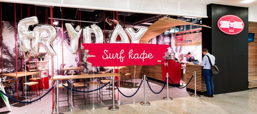 Surf-бар. Необыкновенный формат сети. На ограниченной площади размещены: многофункциональная кухня, посадочные места и дополнительное оборудование. Дизайн Surf-бара разрабатывается индивидуально для каждой локации. Данный формат идеально подходит для размещения на вокзалах, в аэропортах, кинотеатрах, ТРЦ и БЦ.